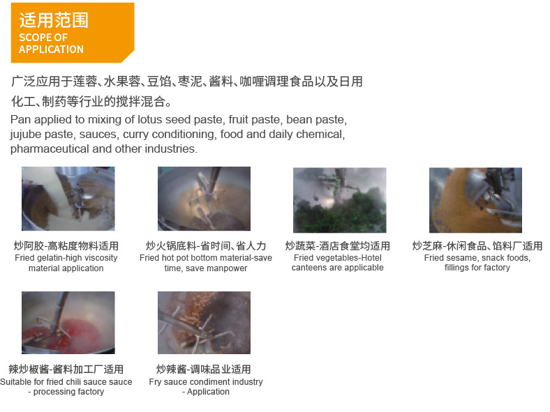 本產(chǎn)品鍋體為一次沖壓成型的半球不銹鋼鍋體,采用電加熱、蒸汽加熱、燃氣加熱,攪拌方式采用特殊的傾斜傳動,使用的行星攪拌器與鍋體充分接觸,實現(xiàn)傳動公轉(zhuǎn)與自轉(zhuǎn)的不整數(shù)傳動比,使鍋內(nèi)無攪拌死角。使用先進的傳動與密封結構,使傳動部分與鍋內(nèi)潔凈、衛(wèi)生。采用變頻調(diào)速動力,運行更平穩(wěn)。電磁加熱形式打破了明火烹調(diào)方式,具有升溫快、無明火、無煙塵、無有害氣體,對周圍環(huán)境不產(chǎn)生熱輻射,安全性好和外觀美觀等特點,是性能優(yōu)良的食品加工設備。